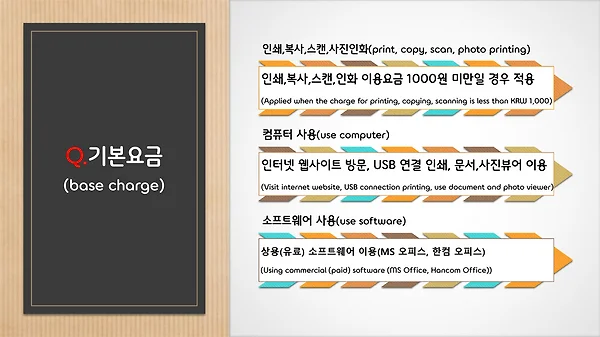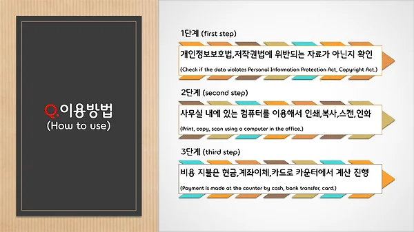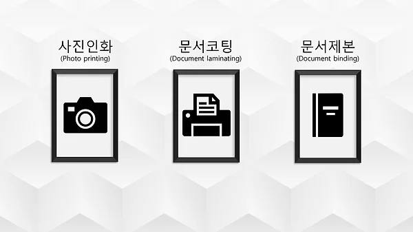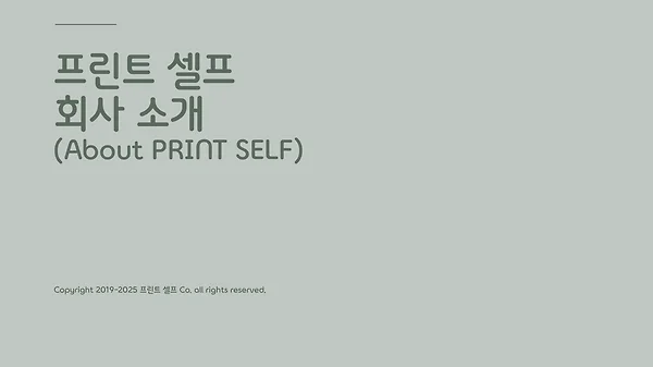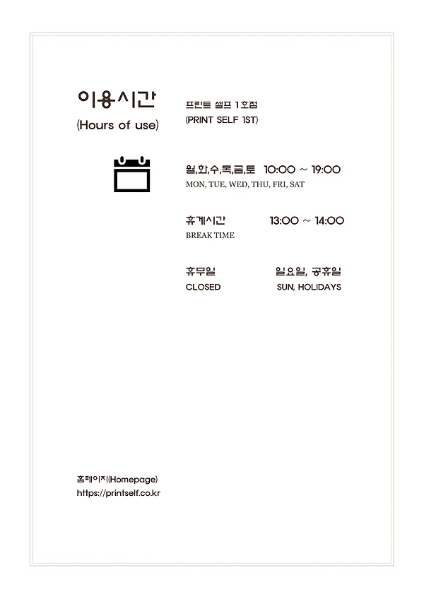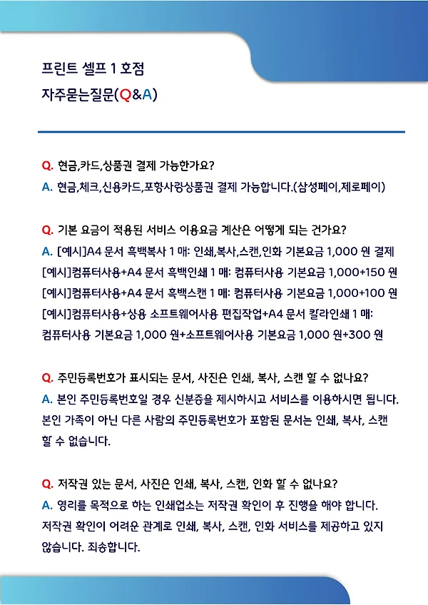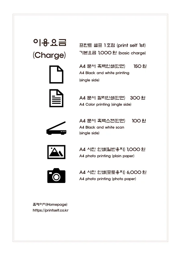PRINTSELF 더보기 회사 소개 01 소개 02 연혁 이용안내 이용방법 기본요금 서비스 항목 문서 인쇄, 복사, 스캔 사진인화, 문서코팅, 문서제본 이용시간 월,화,수,목,금,토 10:00 ~19:00 이용요금 문서 인쇄, 복사, 스캔, 사진인화 자주 묻는 질문(FAQ) 결제 수단, 기본 요금, 저작권 관련